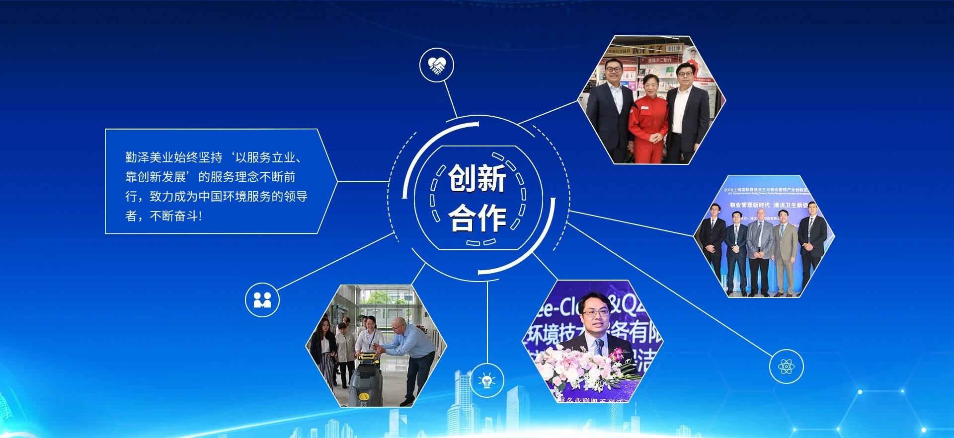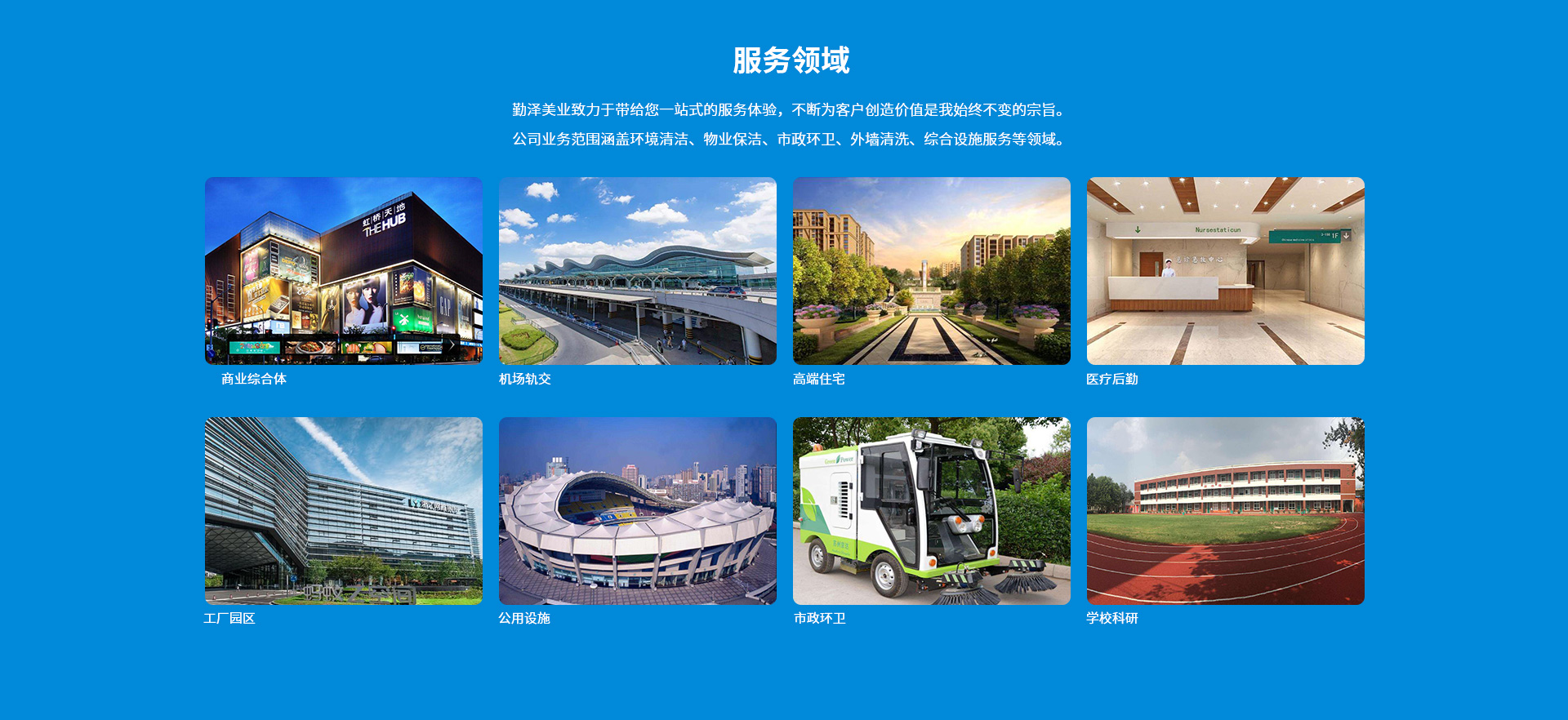 公司致力于把“勤澤美業(yè)”培育成眾口皆碑、令人尊敬、具有長(zhǎng)期價(jià)值的服務(wù)領(lǐng)袖品牌。業(yè)務(wù)范圍涵蓋環(huán)境清潔和綜合設(shè)施管理服務(wù),公司具備環(huán)衛(wèi)、保潔、石材等多個(gè)行業(yè)一級(jí)資質(zhì),致力成為中國(guó)環(huán)境服務(wù)行業(yè)的領(lǐng)導(dǎo)者。